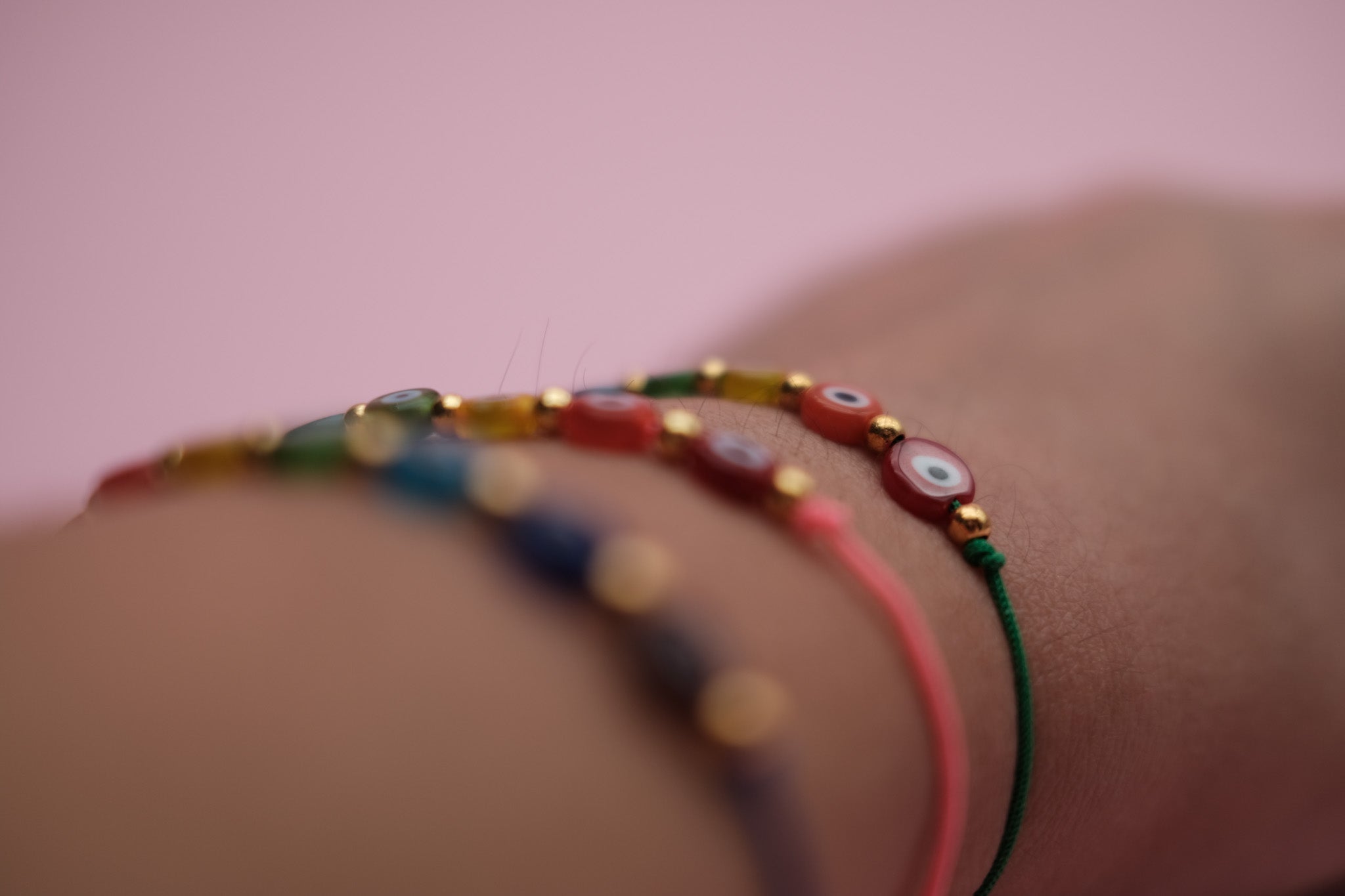 Jedes Armband wird auf einem unterschiedlich farbigen, stabilen Faden gefertigt – so ist jedes Stück ein kleines Unikat!