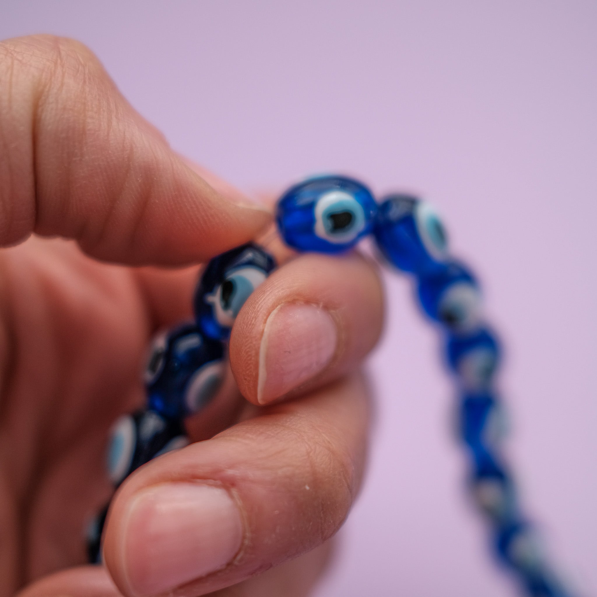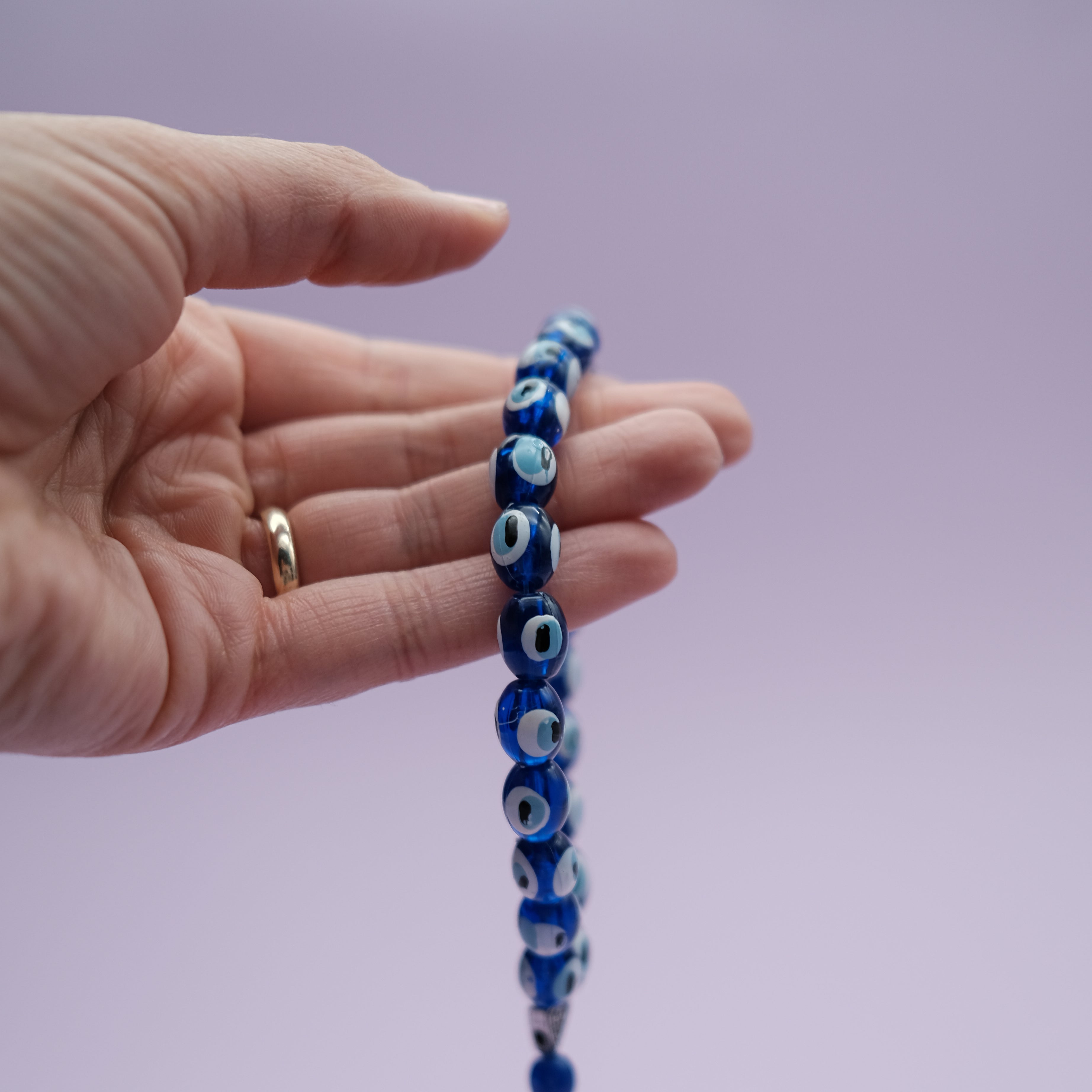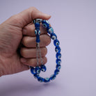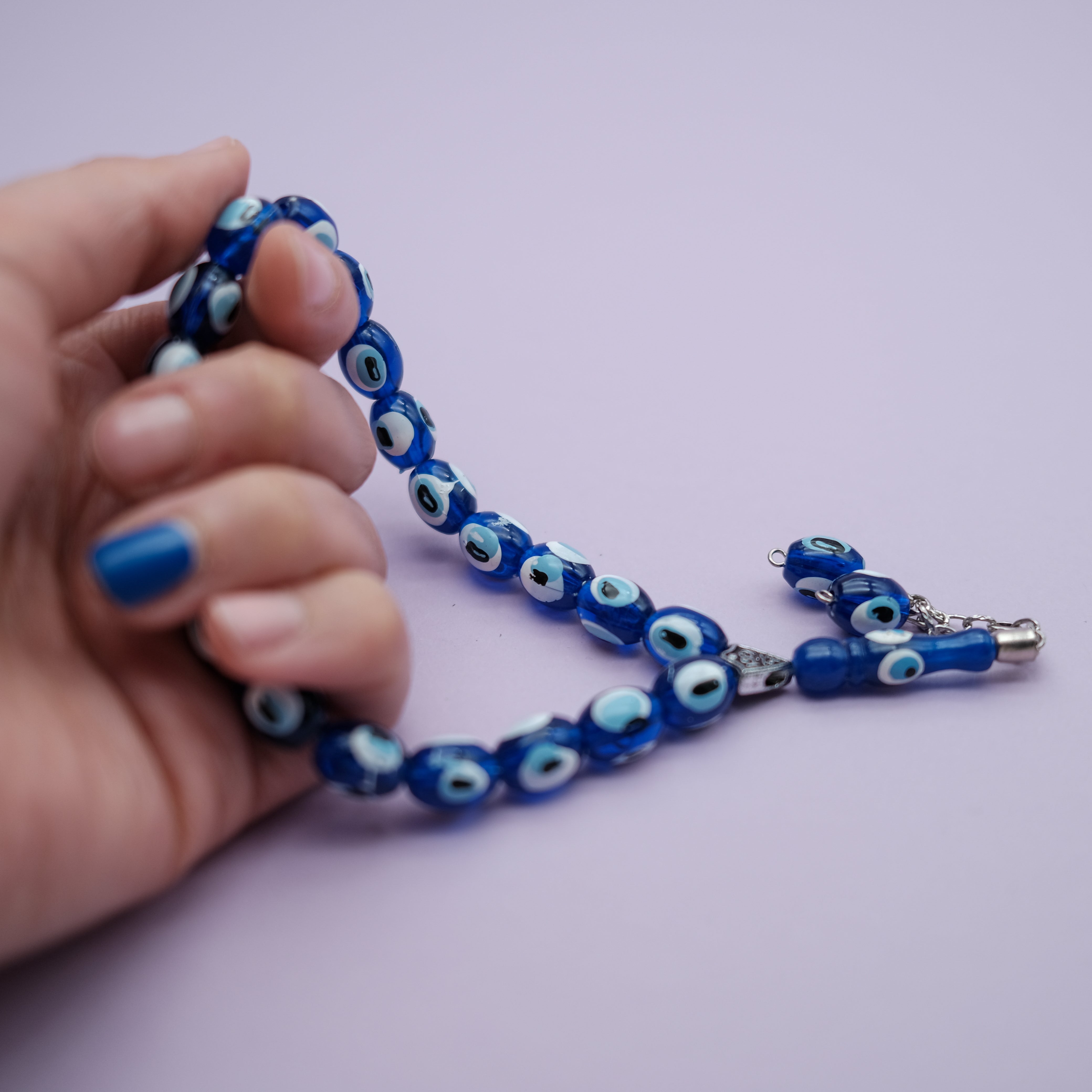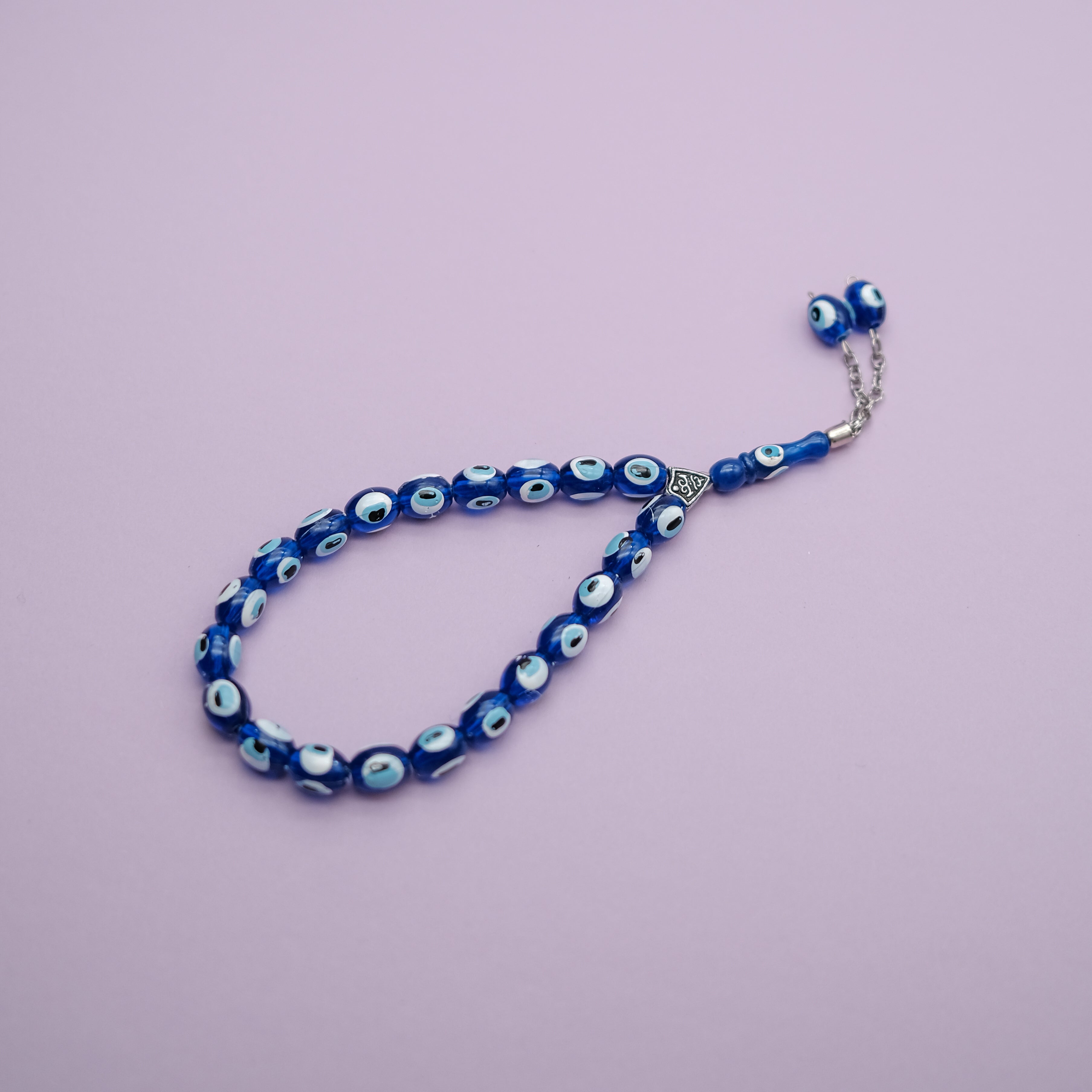 Diese fein gearbeitete Gebetskette verbindet kraftvolle Symbolik mit stilvoller Handarbeit. Die tiefblauen Nazar-Perlen stehen traditionell für Schutz vor dem „bösen Blick“ und werden seit Generationen als spirituelle Begleiter im Alltag genutzt.